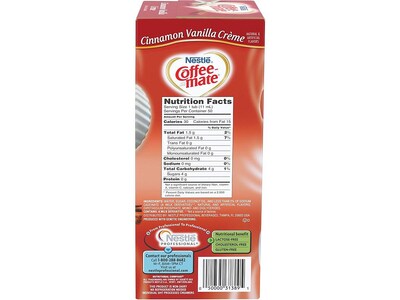 Nestle coffee mate cinnamon vanilla creme flavored liquid creamer singles are irresistible. With no refrigeration necessary and the longest industry shelf life at nine months coffee mate liquid creamer singles are the most popular creamer format great for all food service.