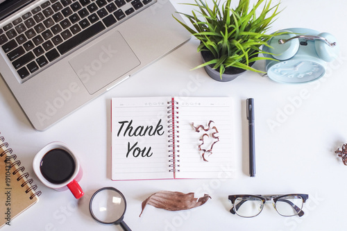 Thank You Concept Top View Of White Office Desk With Laptop Coffee Pen Magnifying Glass Dried Flowers And A Note Book Written With Thank You Text Buy This Stock Photo And Explore Similar Images At Adobe Coffe Wallapper