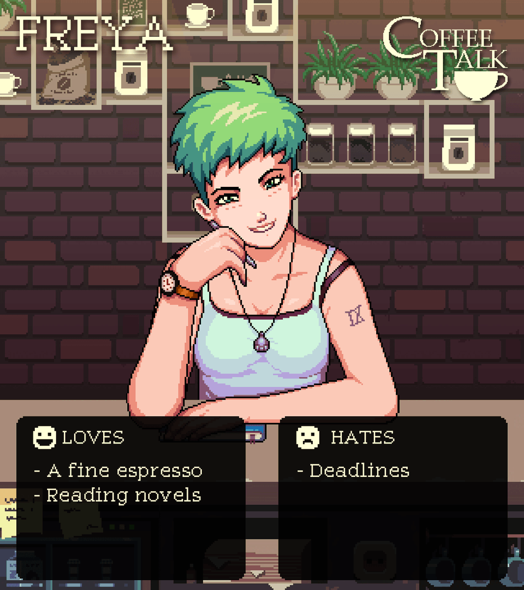 Coffee talk is a game about listening to peoples problems and help them by serving a warm drink out of the ingredients you have. It is a game that tries to depict our lives as humanly as possible while having a cast that is more than just humans. Coffee talk staff ambiguously brown.